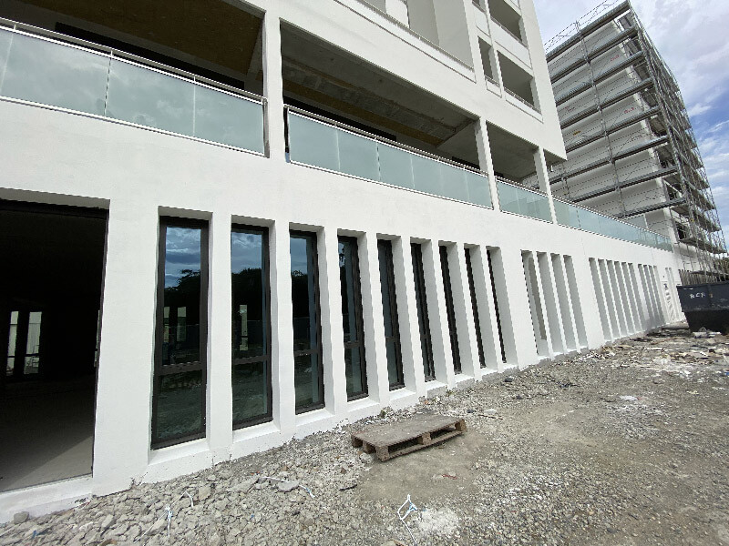 Fabrication et pose de plus de 90 menuiseries extérieures alu Technal gamme Soléal. Fenêtre oscillo battante. Fenêtre avec allège vitrée. Châssis composé avec porte.
